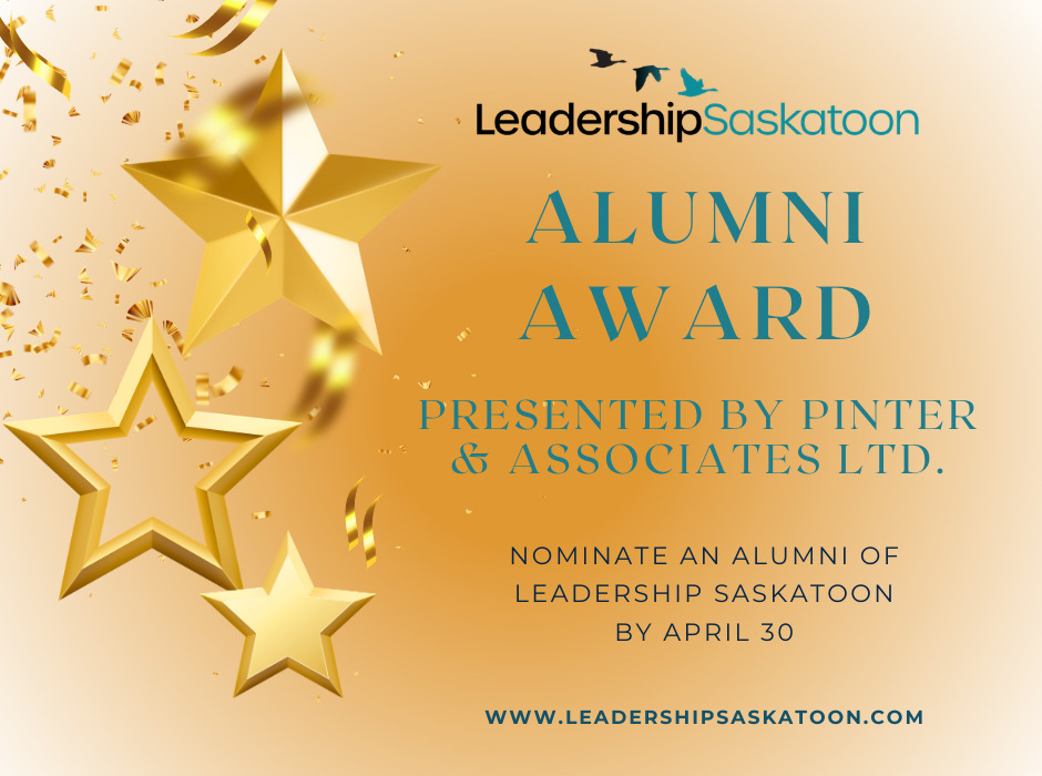 The nomination period for our annual Leadership Saskatoon Alumni Award – Presented by PINTER & Associates Ltd. is open from March 15-April 30, 2026. The award celebrates leaders who have made a significant contribution to Saskatoon and area, grown collaboration, support inclusion and diversity, and continue to promote Leadership Saskatoon. Previous Award winners include Jason Aebig, Kelley Moore, Bill Brooks, Betty Mutwiri, Nancy Lautner, Laurie O’Connor, Sharon Clarke, and Ali Abukar. The Award is presented at our June Graduation Celebration.