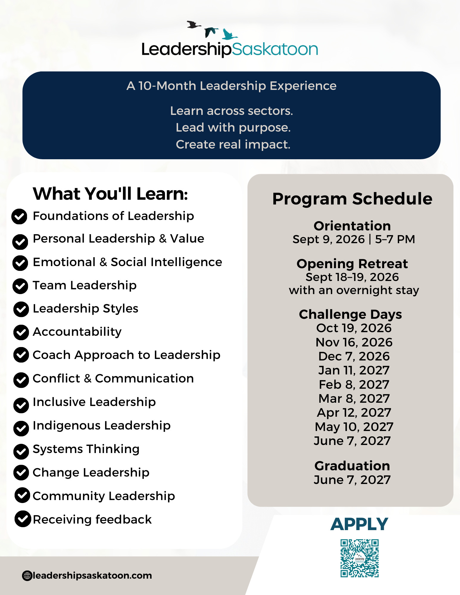 The Leadership Saskatoon Program has been called life-changing by many of our graduates. It’s a full immersion into your personal development as a leader, and you won’t look at yourself or our community in the same way afterwards.